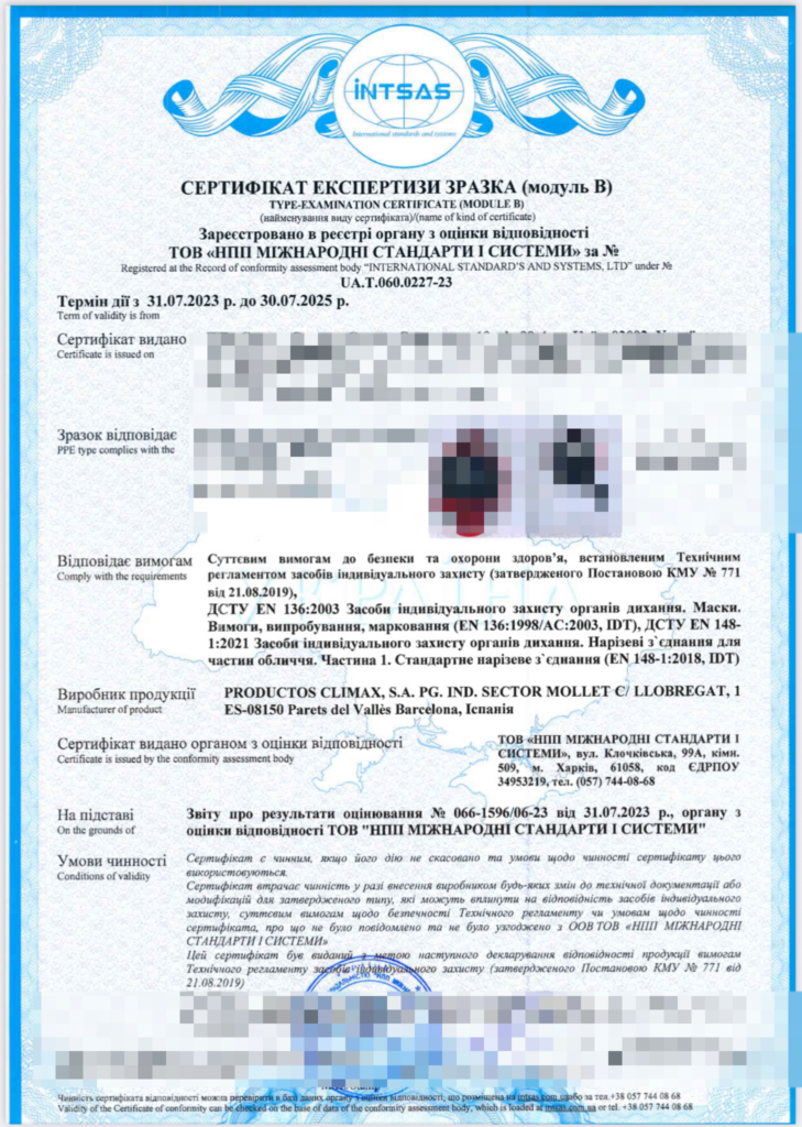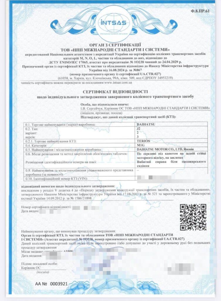Орган з сертифікації ТОВ "НПП МІЖНАРОДНІ СТАНДАРТИ І СИСТЕМИ" акредитований НААУ у відповідності до Порядку затвердження конструкції транспортних засобів, їх частин та обладнання та Порядку ведення реєстру сертифікатів типу транспортних засобів та обладнання і виданих виробниками сертифікатів відповідності транспортних засобів або обладнання, затверджені наказом Міністерства інфраструктури України 17 серпня 2012 р. № 521, зареєстрований у Міністерстві юстиції України 14.09.2012 за № 1586/21898 (атестат акредитації № 1О238 від 25.04.2024 р.).