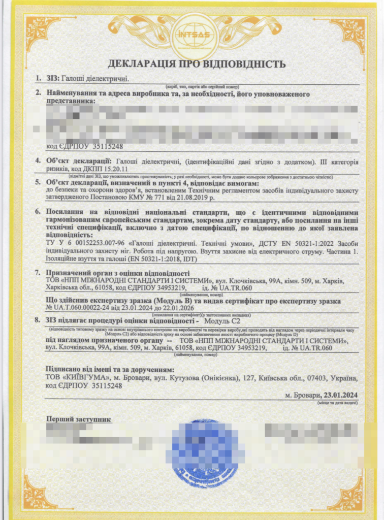 – декларація про використані матеріали та комплектуючі вироби, які можуть впливати на показники, що сертифікуються.